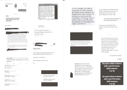 ‘Diary of a Bootlegger’ is a work of digital cut-outs. The emails, tweets, and text messages here replace the pre-Internet paper scrapbooks of clippings, thoughts, exchanges, in-jokes, and appropriations. The form is suggestive of the Sports Banger aesthetic, a clued-in hybrid of political commentary, sportswear chic, and proud class consciousness. Through this curated sequence of customer service emails, twitter “content”, family chats, and warehouse humour, the story of Jonny Banger’s seemingly improbable rise is told, from a DIY outfit bootlegging well-known sports brands to becoming one of the most talked about fashion phenomenons of the last decade.