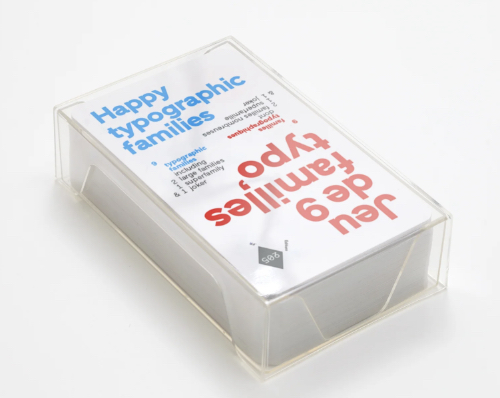 Improve your knowledge of typography and type families around a game of cards. Based on the “official” Vox-AtypI classification developed in 1954 by Maximilien Vox (1894–1974), this deck of cards presents each type family in detail, including their origins, characteristics, historical context, and more. Besides these nine families, you can discover the featured typefaces through specimens that contain and reveal a number of episodes from the history of typography. The game also paints a portrait of type design through the centuries and provides a glimpse of contemporary type design by presenting a number of recent developments from internationally recognised foundries.
